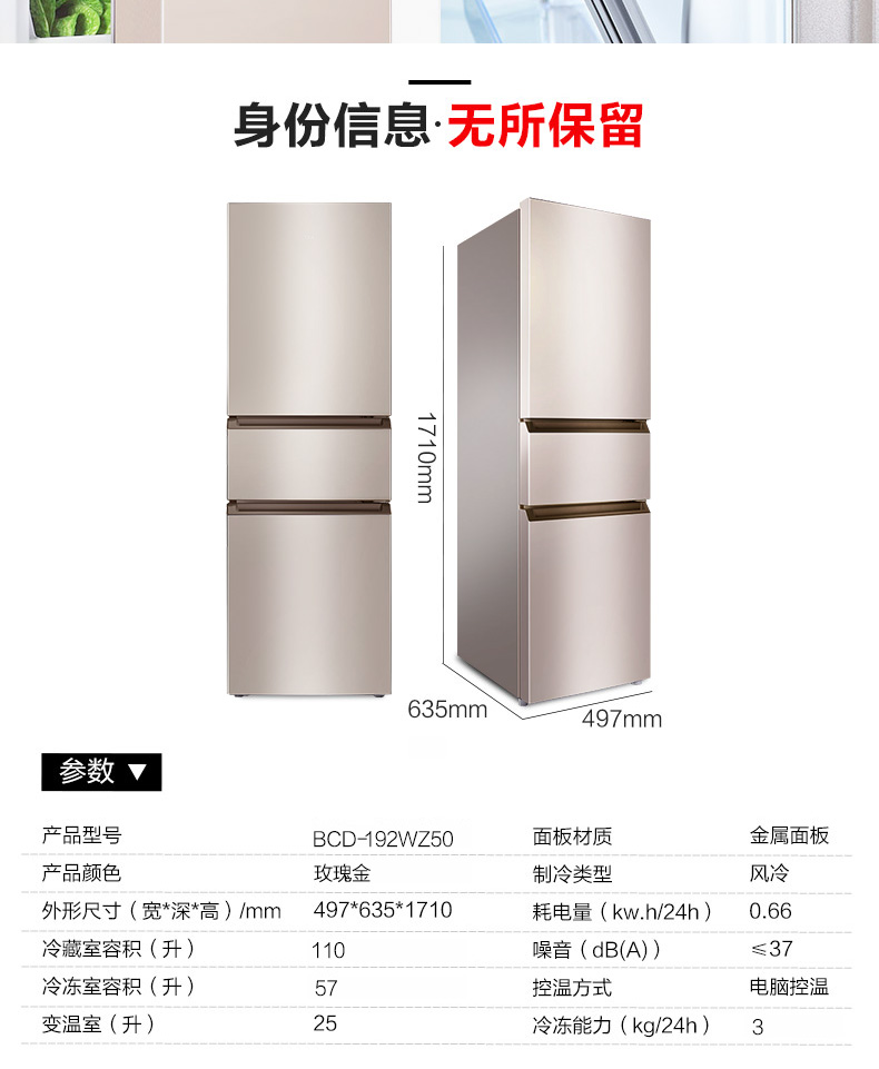 商品名稱:TCL冰箱 BCD-192WZ50三門冰箱 192升大(dà)容量 風冷(lěng)無霜 電腦(nǎo)溫控 家用(yòng)節能(néng)靜音(yīn) 冷(lěng)藏冷(lěng)凍電冰箱 玫瑰金(jīn)