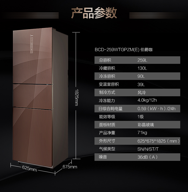 商品名稱美(měi)的(de)冰箱 BCD-259WTGPZM(E)伯爵咖